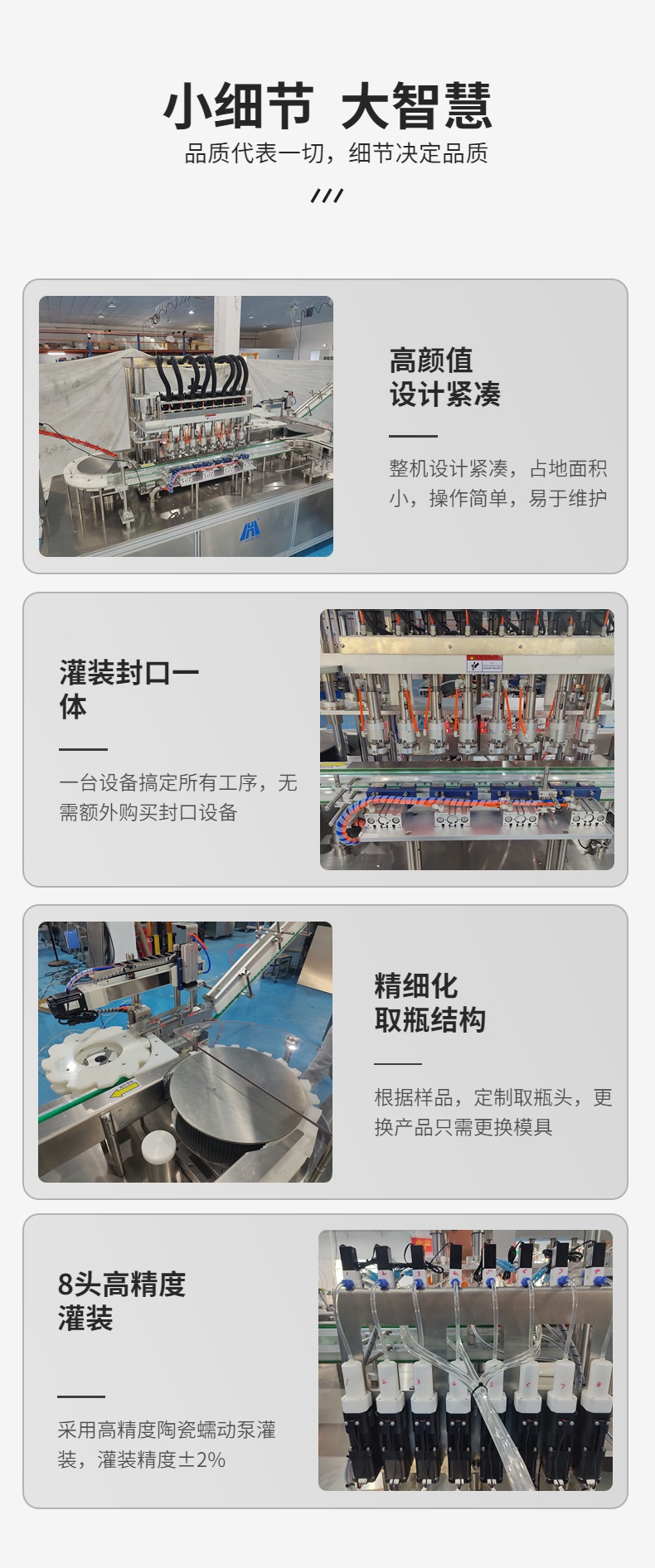 29年深耕灌裝包裝行業,可根據客戶實際空間位置及産品類型量身定制灌裝生産線,精确掌握,産品與實際需求契合度高,滿足通過軟硬件開發及軟件控制實現智能化、提效率、降成本。