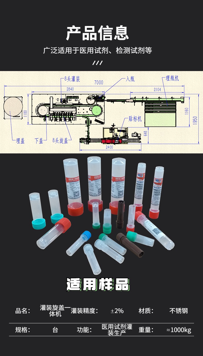 全自動核酸檢測試劑灌裝旋蓋機,适用于3ml-20ml采樣管核酸檢測試劑灌裝生産,每小時産量10000瓶。單人份、十人份、二十人份采樣管通用。