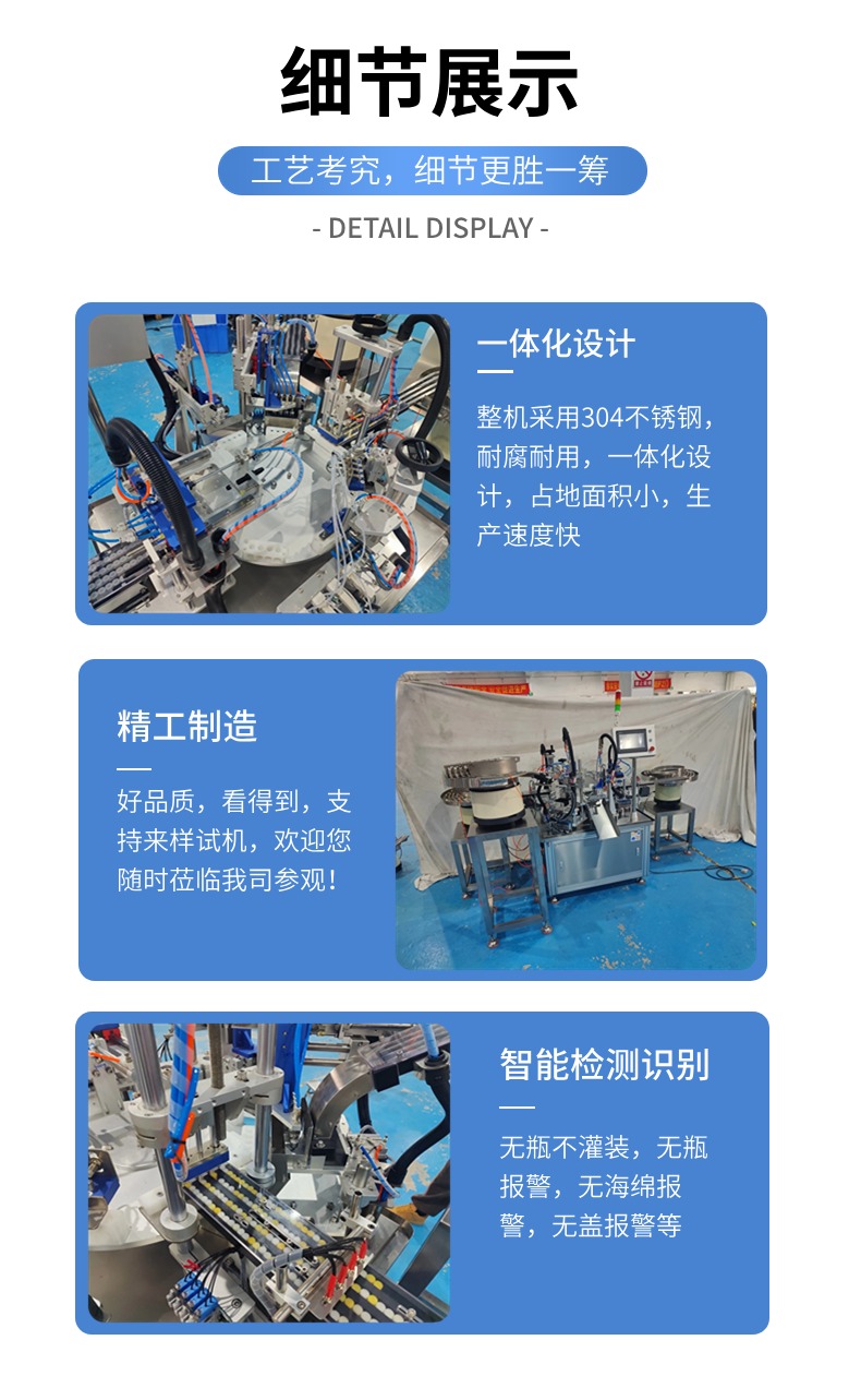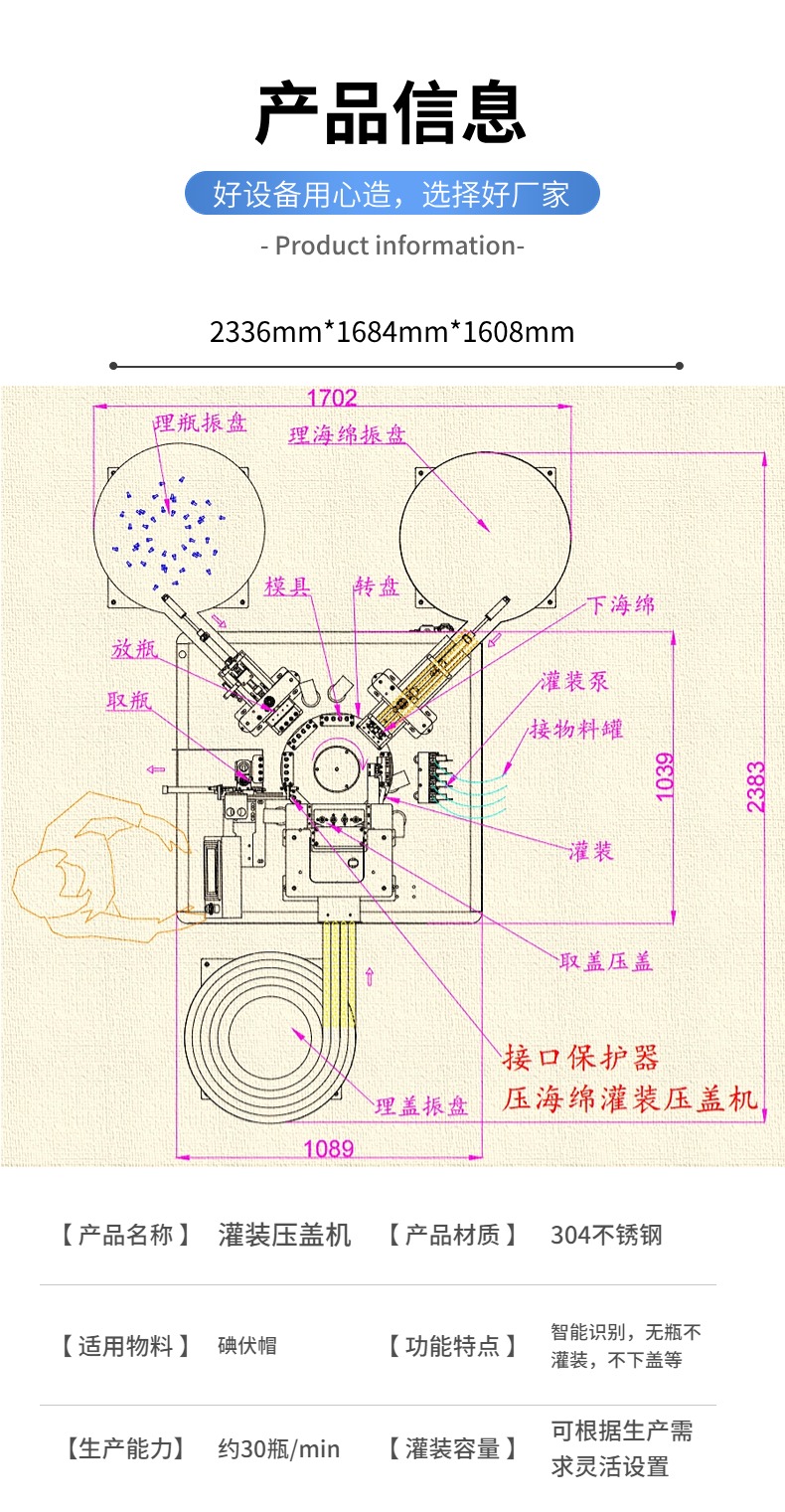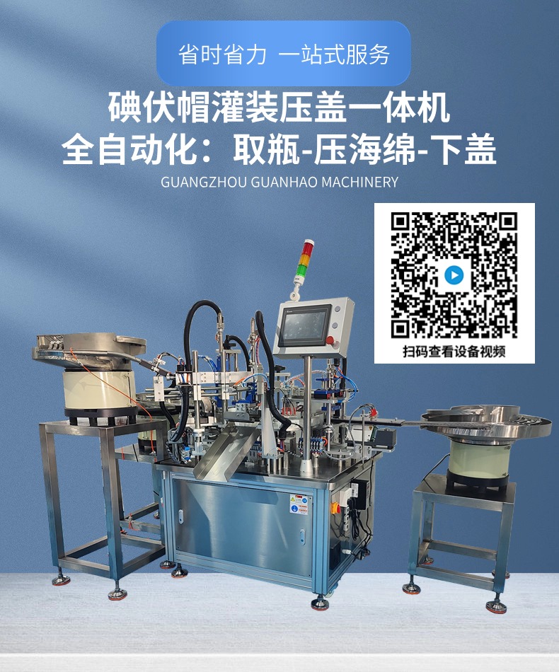 全自動碘伏帽灌裝機,工藝流程:自動理瓶-自動取瓶-自動壓海綿-自動灌裝-自動下蓋-收料。全程自動化完成。整機占地面積小,設備運行穩定
